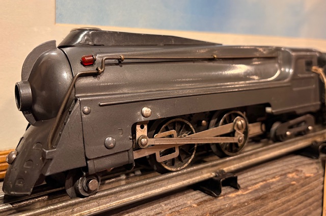 American Flyer train set, 1939, 417 Dreyfuss train set. The Art Deco 0-gauge locomotive and tender are in gunmetal grey. Parts include: Texico tanker, passenger and cattle car. The track consists of 2 switches, 10 straights, 13 curves (S), 4 curves (L), and a transformer.