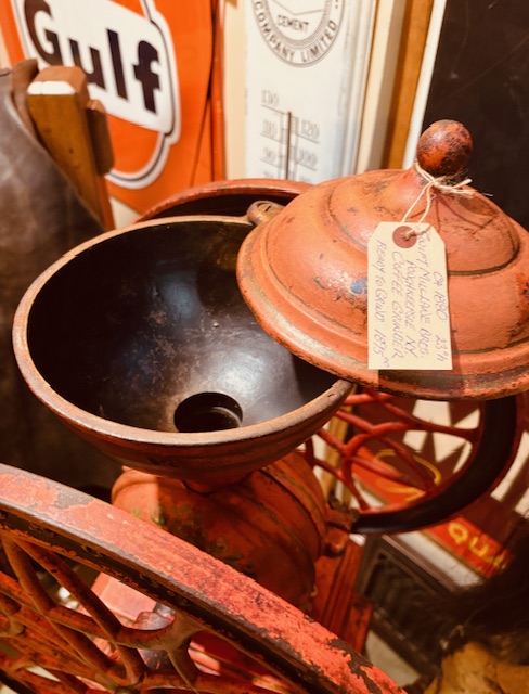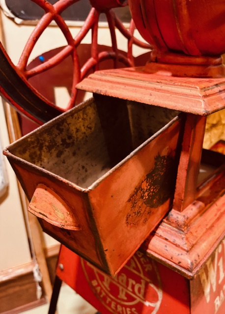Antique Commercial coffee mill. Ca. 1880 double-wheeled cast iron coffee mill in red and blue paint, with original hinged lid and tin grounds drawer, embossed The Swift Mill, Lane Brothers, Poughkeepsie, N.Y. on each wheel and 140 on top of base; 24″h