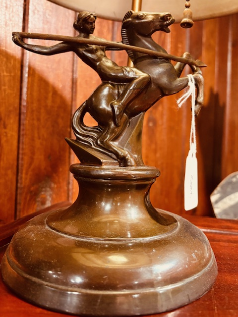 Art Deco Lamp 1930s. Deco table lamp Bronze with copper shade 1920s-30s. Woman riding a horse with spear in hand. 16-1/2″ high and has been rewired.