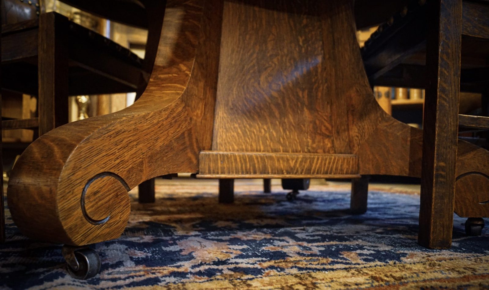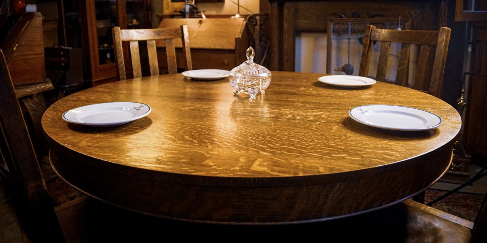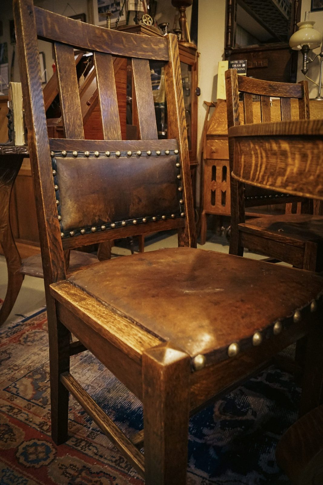 Stickley era Dining set, Arts and Crafts Dining Tiger Oak Dining table and chairs. Arts and Crafts Dining Tiger Oak Dining table and chairs. This set is truly a rare find! Built by George McLagan in Stratford, Ontario in 1905. McLagan apprenticed under the Stickley Brothers in Grand Rapids Michigan, where he learned to design and build Arts and Crafts styled furniture. The table and chairs are made of quarter-sawn tiger oak, with two leaves and the center leg. The seat and back of the chairs have their original leather, rich red, tacked in by old metal studs. An exceptional piece that seats 8 with the 2- leaves and can extend to 9′-10″ and seat 12-14 people.