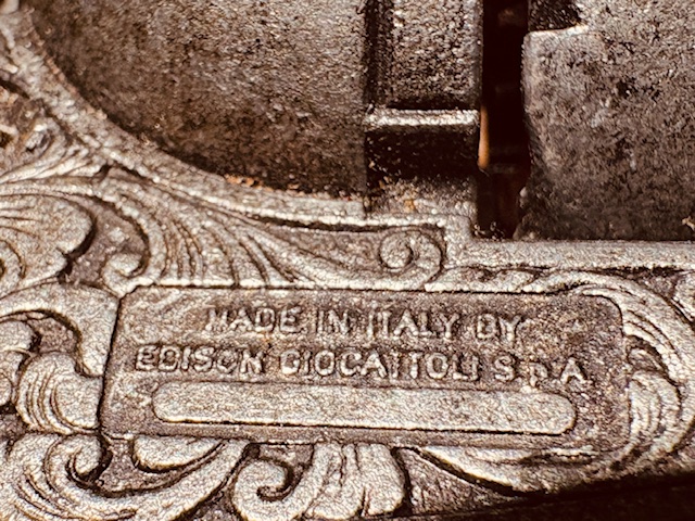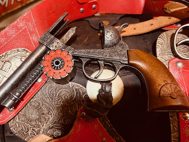 Vintage Gun Holster set.  Revolvers are cast metal with plastic handles made by the Edison Giocattoli toy company in Italy. Holsters are genuine leather with metal accents. Great detail, the belt is 34″ long.